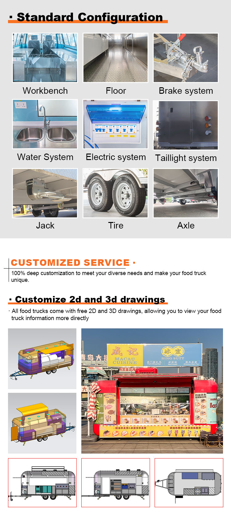 Jako główny materiał wybraliśmy wysokiej jakości stal nierdzewną 304, która jest znana z doskonałej odporności na korozję i doskonałej trwałości, a także może utrzymać stabilną wydajność w różnych warunkach środowiskowych, zapewniając, że nasze produkty do przyczep gastronomicznych mogą zachować doskonałą jakość i funkcjonalność nawet w dłuższej perspektywie i stawić czoła różnorodnym wyzwaniom. Doskonała odporność stali nierdzewnej 304 na korozję, dzięki czemu na ciężarówkę nie jest łatwo podatne utlenianie lub rdza, co znacznie wydłuża jej żywotność. Doskonała odporność na korozję stali nierdzewnej 304 sprawia, że ciężarówki są mniej podatne na utlenianie i rdzę, co znacznie wydłuża ich żywotność.