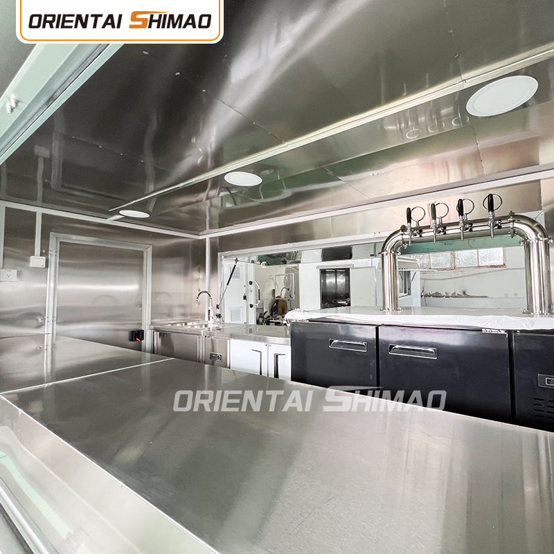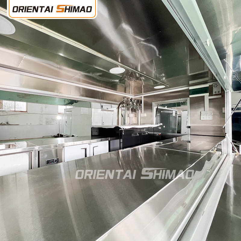 W projektowaniu konstrukcji wewnętrznej wykazujemy się także niezwykłym kunsztem wykonania. Unikalny proces artykulacji zapewnia płynne połączenie ściany ze stołem warsztatowym. Taka konstrukcja nie tylko poprawia ogólną estetykę, ale także znacznie upraszcza prace czyszczące, bez użycia klejów, takich jak klej, unikając problemów takich jak odpryski kleju, odbarwienia, a jednocześnie zmniejsza możliwość zabrudzeń, tworząc czystsze i bardziej uporządkowane środowisko pracy dla operatora. Ta dbałość o szczegóły i kontrola są kluczem do wyróżnienia się firmy Oriental Shimao Dessert Food Trucks na konkurencyjnym rynku.