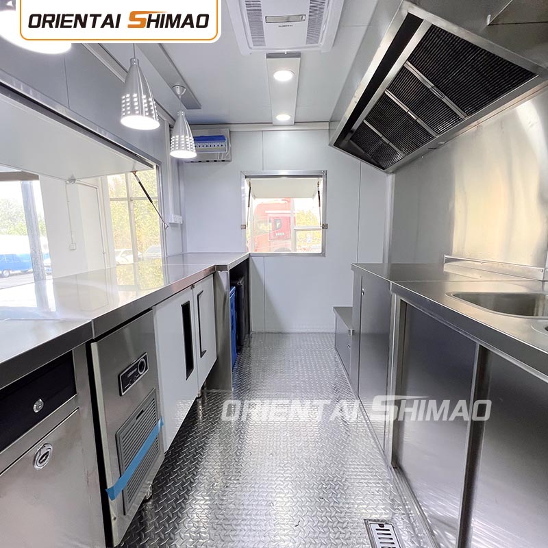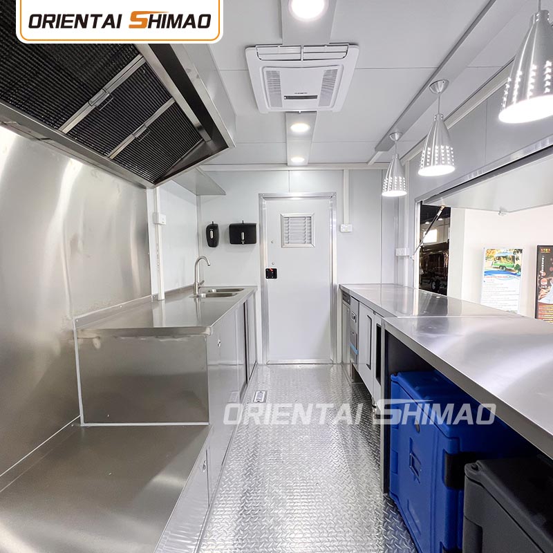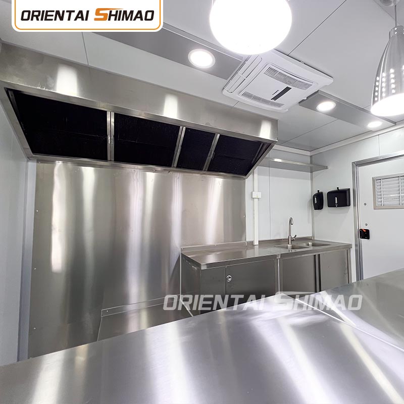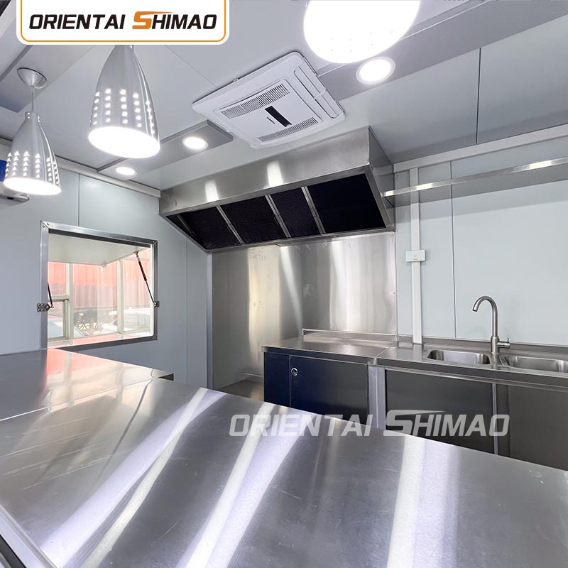 Układ wnętrza: Rozsądne planowanie kuchni, jadalni, miejsca do przechowywania i innych obszarów, aby zapewnić maksymalne wykorzystanie przestrzeni. Jednocześnie, zgodnie z potrzebami biznesowymi, tworzone są różne obszary funkcjonalne, takie jak obszar produkcyjny, obszar grzewczy, obszar sprzedaży itp., Aby ułatwić obsługę i poprawić efektywność operacyjną.