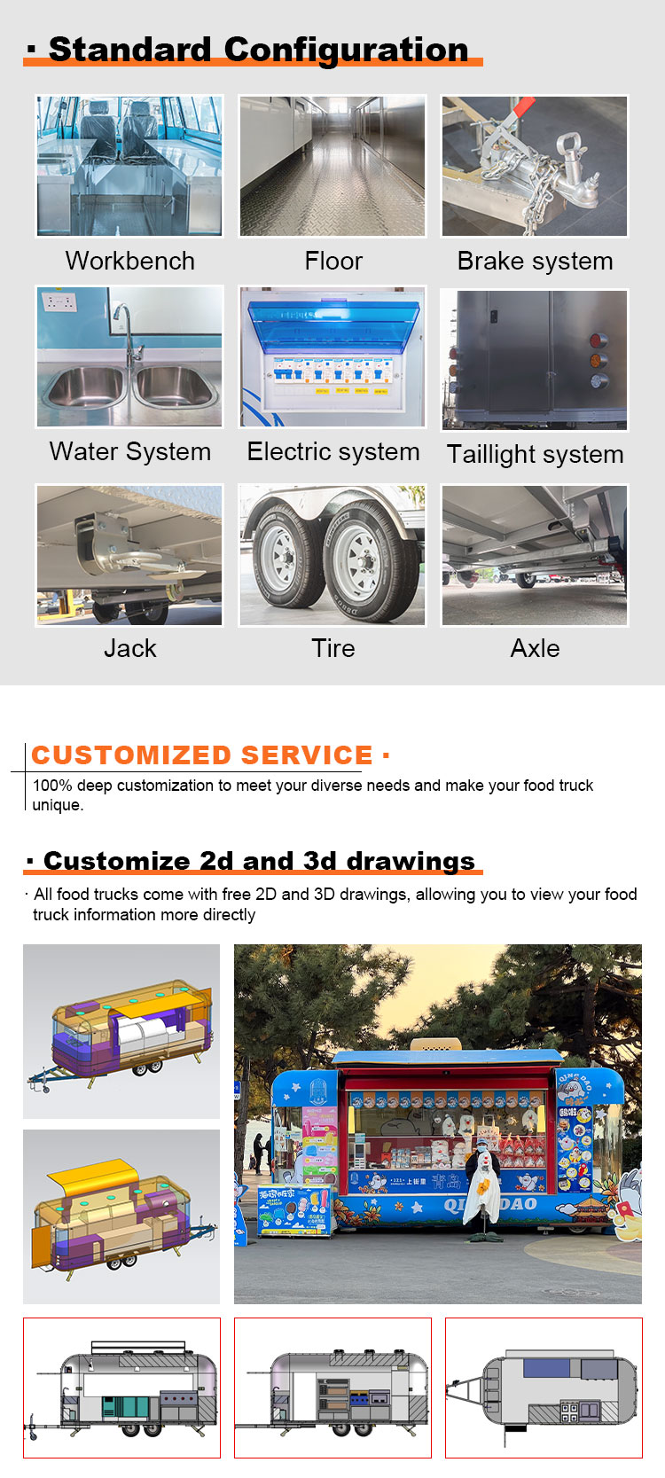 Jako główny materiał wybraliśmy wysokiej jakości stal nierdzewną 304, która jest znana z doskonałej odporności na korozję i doskonałej trwałości, a także może utrzymać stabilną wydajność w różnych warunkach środowiskowych, zapewniając, że nasze produkty do przyczep gastronomicznych mogą zachować doskonałą jakość i funkcjonalność nawet w dłuższej perspektywie i stawić czoła różnorodnym wyzwaniom. Doskonała odporność stali nierdzewnej 304 na korozję, dzięki czemu na ciężarówkę nie jest łatwo podatne utlenianie lub rdza, co znacznie wydłuża jej żywotność. Doskonała odporność na korozję stali nierdzewnej 304 sprawia, że ciężarówki są mniej podatne na utlenianie i rdzę, co znacznie wydłuża ich żywotność.