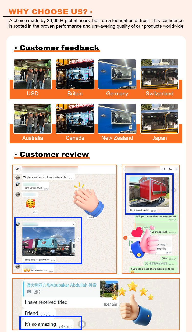 Jako główny materiał wybraliśmy wysokiej jakości stal nierdzewną 304, która jest znana z doskonałej odporności na korozję i doskonałej trwałości, a także może utrzymać stabilną wydajność w różnych warunkach środowiskowych, zapewniając, że nasze przyczepy gastronomiczne mogą zachować doskonałą jakość i funkcjonalność nawet w dłuższej perspektywie i stawić czoła różnorodnym wyzwaniom. Doskonała odporność stali nierdzewnej 304 na korozję, dzięki czemu na ciężarówkę nie jest łatwo podatne utlenianie lub rdza, co znacznie wydłuża jej żywotność. Doskonała odporność na korozję stali nierdzewnej 304 sprawia, że ciężarówki są mniej podatne na utlenianie i rdzę, co znacznie wydłuża ich żywotność.