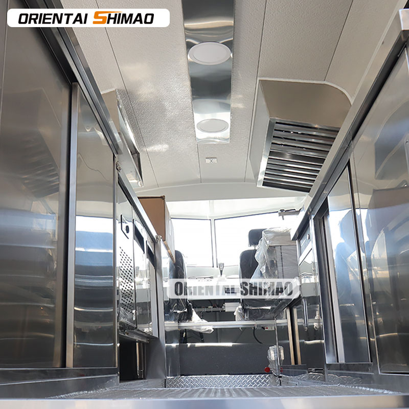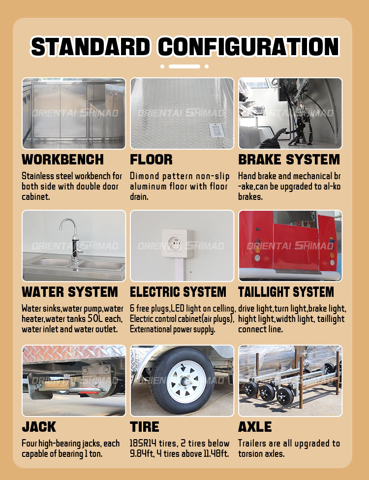 Układ wnętrza: Układ wnętrza przyczepy został starannie zaprojektowany i można go elastycznie dostosować zgodnie z różnymi potrzebami biznesowymi. Zarówno umieszczanie sprzętu kuchennego, jak i projektowanie tabeli operacyjnej uwzględniają wygodę i wydajność użytkownika.