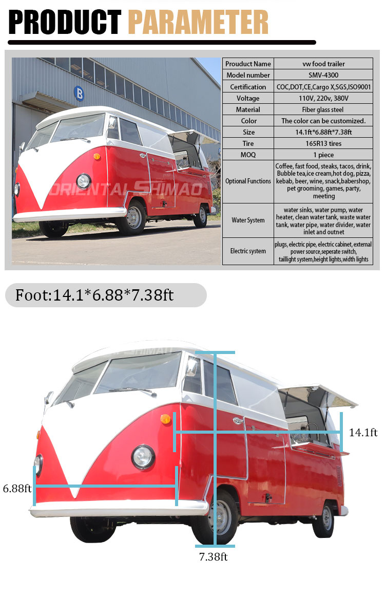 Oriental Shimao High Roof VW Food Truck (model: SMV-4300) to wysokiej klasy mobilne rozwiązanie kuchenne zaprojektowane do wszechstronnych zastosowań cateringowych i komercyjnych. Niezależnie od tego, czy jest to jedzenie uliczne, napoje kawowe, czy różnorodne usługi gastronomiczne, ta przyczepa ma cię pokryć. Jest on konstruowany przy użyciu starannie wybranych materiałów jakościowych i zaawansowanych procesów produkcyjnych, aby zapewnić doskonałą wydajność i długą trwałość w różnych środowiskach. Przyczepa żywności Street Airstream jest niewątpliwie najlepszym wyborem dla przedsiębiorców, którzy chcą odcisnąć swoje piętno w branży mobilnej.