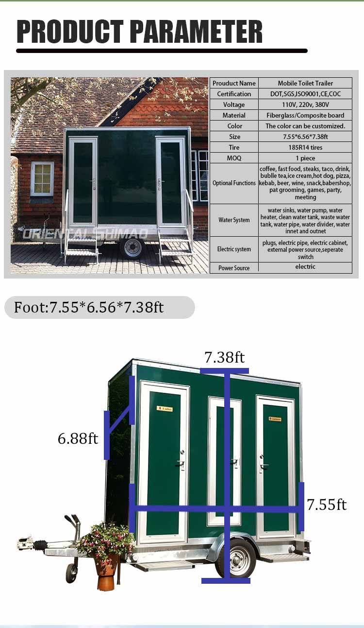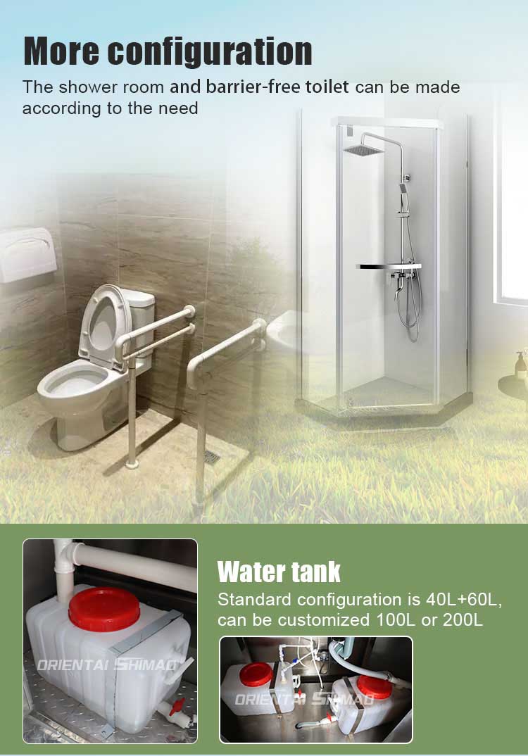 Oriental Shimao Mobile Toolet House to optymalne rozwiązanie sanitarne dla szerokiej gamy miejsc zewnętrznych, potrzeb tymczasowych i sytuacji awaryjnych. Dzięki nowoczesnemu projektowi i doskonałym zestawowi funkcji zapewnia nie tylko użytkownikom wygodne wrażenia z toalety, ale także poprawia standard higieny całego miejsca. Niezależnie od tego, czy jest to duże wydarzenie, plac budowy, czy reakcja awaryjna, ta przenośna toaleta zapewnia czyste i wygodne środowisko.