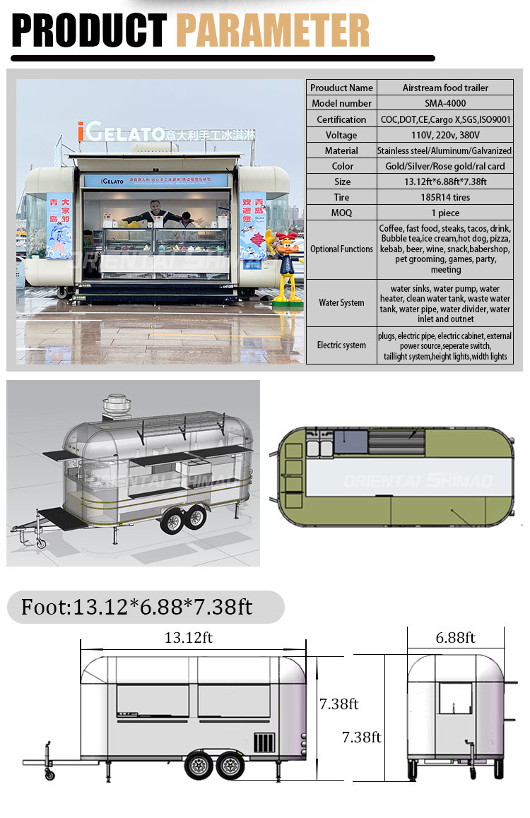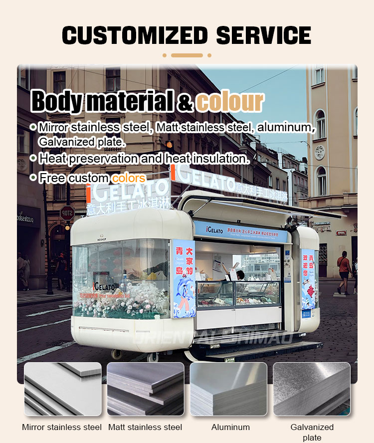 Złota stal nierdzewna: zewnętrzna część food trucka wykonana jest z wysokiej jakości złotej stali nierdzewnej. Materiał ten ma nie tylko doskonałą odporność na korozję i ścieranie, ale także złoty wygląd zwiększa piękno wizualne i wysoką jakość, dzięki czemu food truck może wyróżniać się w różnych środowiskach.