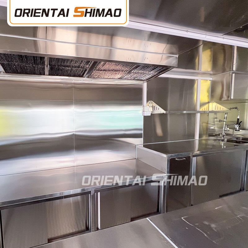 Stal nierdzewna: Stal nierdzewna jest również jednym z powszechnych wyborów paneli zewnętrznych, zwłaszcza stali nierdzewnej 304 dopuszczonej do kontaktu z żywnością. Stal nierdzewna jest odporna na korozję, wysoką temperaturę i łatwa do czyszczenia, dzięki czemu nadaje się do stosowania w kuchniach, ladach i innych obszarach mających kontakt z żywnością. Jednocześnie piękno stali nierdzewnej może również poprawić ogólną teksturę food trucka.